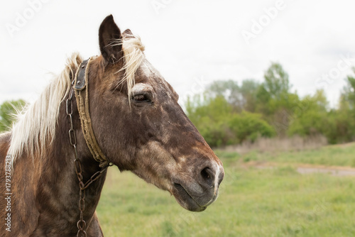 Domestic brown horse muzzle close-up.Horse as a symbol of 2026.