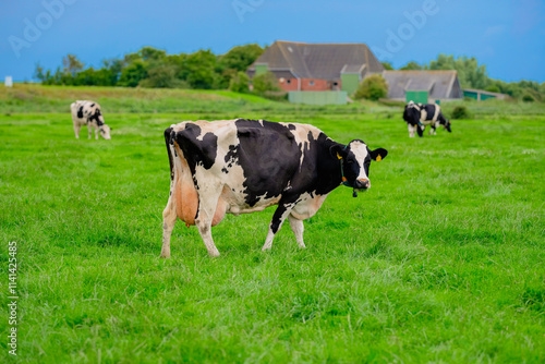 Domestic Farming. Grazing cows. Cows at field. Cow herd at green pasture. Countryside landscape and pasture for cows. Cow herd in the countryside. Cows on farmland.