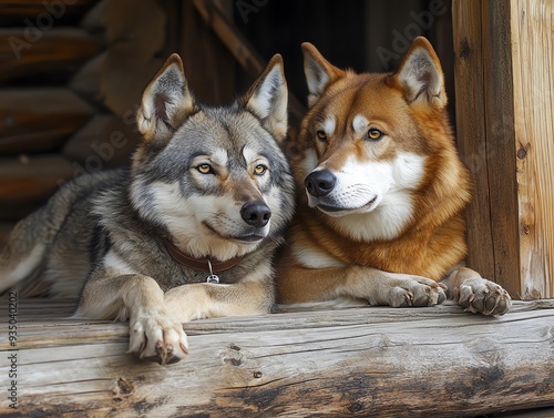 Domesticated wolf with a collar resting beside a hound on a porch, wild to tame transition, companion animals