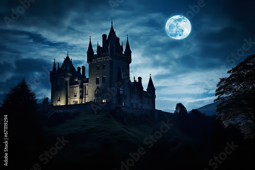 Dominating the landscape, a dark castle stands tall, its spires and battlements outlined by moonlight, creating a scene of haunting beauty and timeless tales.