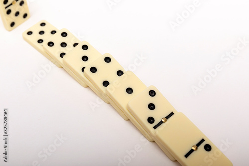 Domino background. Business strategy concept. The domino effect stopped by a unique, one strong piece.