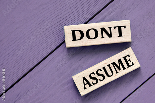 DONT ASSUME - words on wooden block on a purple background