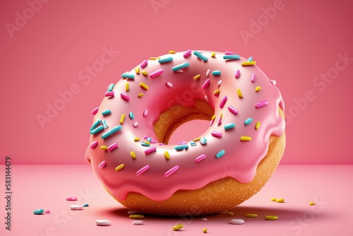 Donut with pink icing and sprinkles isolated on pink background, Generative AI