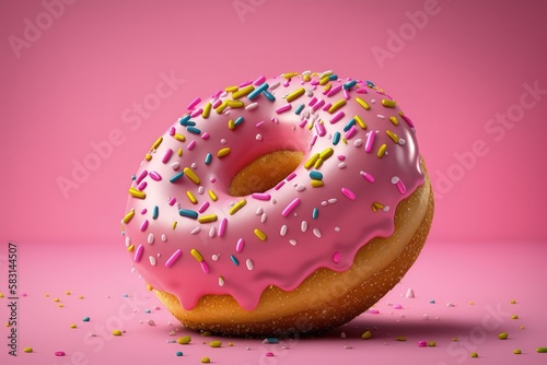 Donut with pink icing and sprinkles isolated on pink background, Generative AI
