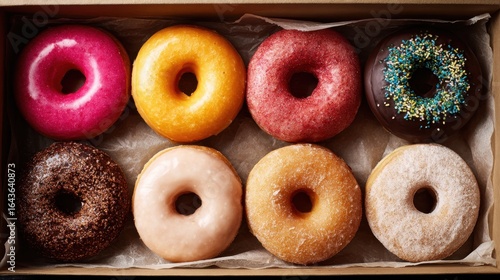 Donuts in Branded Takeaway Box – Wax Paper Liner, Bright Food Delivery Photo