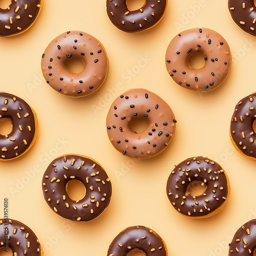 Donuts seamless pattern with icing and chocolate glaze on pastel yellow background. Sprinkled sweet and colourful glazed doughnut. Flat lay. Mocha Mousse - color of the year 2025