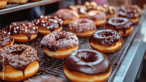 Donuts with a chocolate topping in a candy workshop setting. dessert, pastry, sweet, preparing