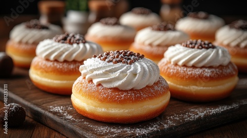 Donuts with Cream and Chocolate Sprinkles on Wooden Board