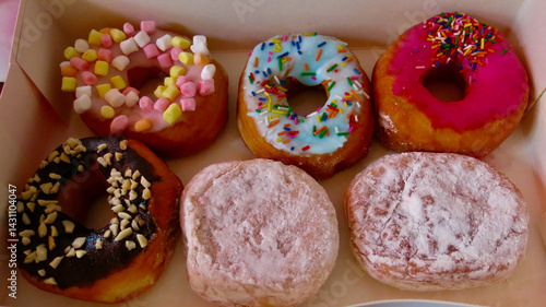 Donuts with icing sugar. Top view of donuts with powdered sugar in a box. Six round multi-colored donuts in a box.