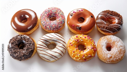 donuts with various flavors and toppings are available various flavors of donuts on a white background