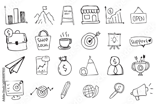 Doodle business hand drawn icon set. Business idea, startup doodle line icon set, Black background