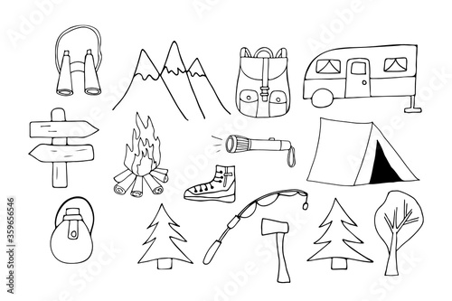 Doodle camping icon collection. Hand drawn camping icon collection. Camping icons set