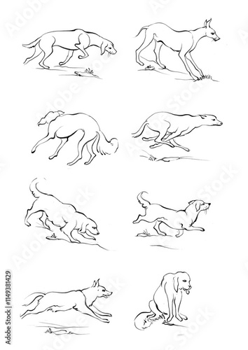 Doodle Cartoon dog illustration set in different poses. Cute sitting, running and lying vector dog isolated on white background