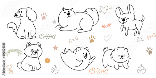 Doodle Cartoon dog illustration set in different poses. Cute sitting, running and lying vector dog isolated on white background