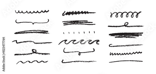 Doodle chalk underlines set. Black line sketches with charcoal marks. Hand drawn vector elements on white background.