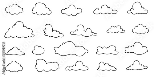 Doodle Cloud Shapes Vector Collection. 20 Black and White Line Art Clouds, Isolated on White Background. Perfect for Weather Designs and Children’s Illustrations
