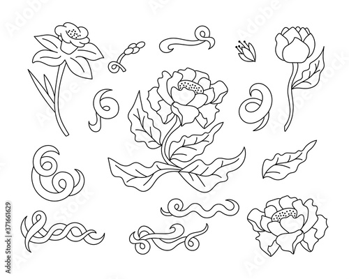 Doodle coloring flower with leaf and wave isolated on white. Bundle hand drawing art line. Sketch vector stock illustration. EPS 10