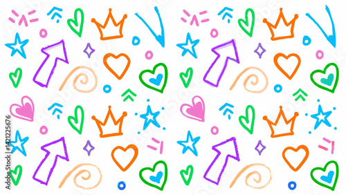 Doodle elements vector set, Hand-drawn shapes collection, Colorful scribble design elements, Marker sketch vector icons, Colorful hand-drawn doodles of arrows, hearts, stars, and crowns