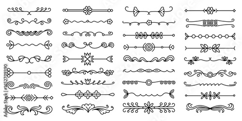Doodle floral ornament divider. Decorative glyph stroke, elegant minimalistic border elements with simple flower leaf shape. Vector wedding invitation dividers set