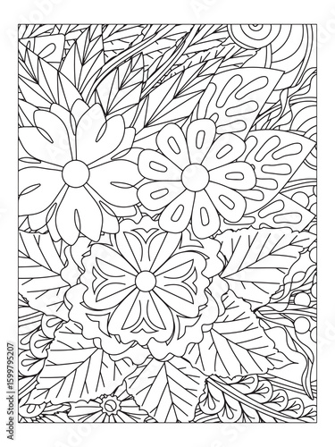 Doodle floral pattern in black and white. Page for coloring book. For adult and kids. Vector doodle flowers in black and white.