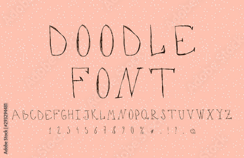 Doodle font. Original hand drawn letters of the English alphabet, numbers and signs. Vector 10 EPS.