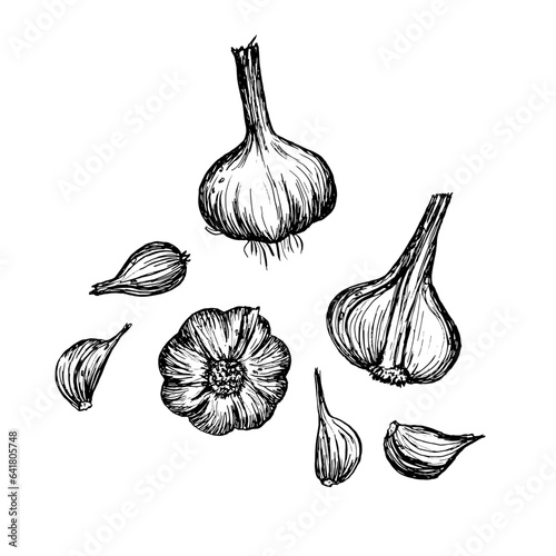 Doodle garlic vector set. Hand drawn garlic sketch isolated on white background. Garlic heads and cloves.