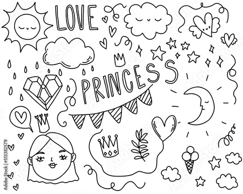 Doodle line princess cute elements. Sketch set scribble isolated line collection.