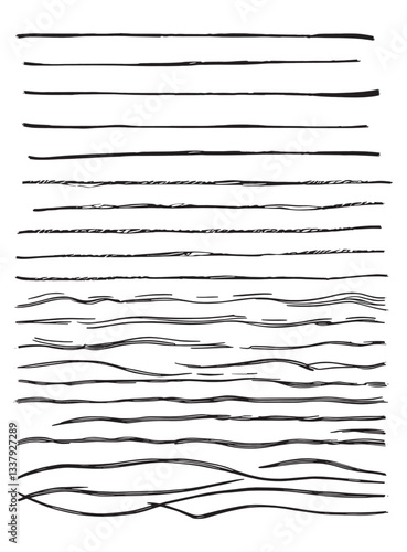 Doodle line set, Horizontal Line Variations from Straight to Wavy – Black Drawing Elements on White Background, Texture, Art Education, Vector