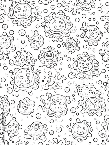Doodle Microbe Mashup Seamless Pattern for Kids, Line Art style