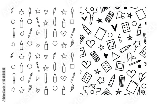 Doodle pattern on background: Two whimsical doodle patterns with a variety of freehand elements creating seamless background with cute shape.