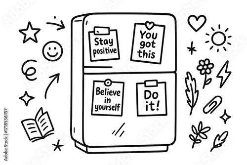 Doodle Refrigerator Door. Hand-drawn doodle illustration Refrigerator door with inspirational quotes [refrigerator, note card, magnet, star, heart, smiley