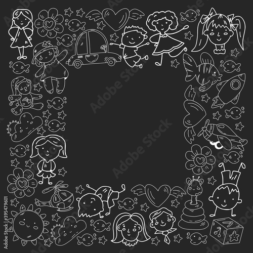 Doodle set of objects for kids. Toys and boys and girls. Kindergarten children. Vector outline icons