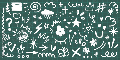 Doodle set with clouds, stars, and arrows. Whimsical clouds, playful stars, and dynamic arrows. Perfect for creative projects needing clouds, stars, and arrows. White doodle elements, vector set.