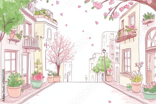 Doodle shows a vibrant spring city street with flower-filled windows and blooming trees, creating a cheerful vibe. Generative AI