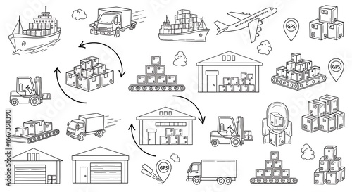 Doodle sketch of global logistics and distribution, including various transportation and delivery