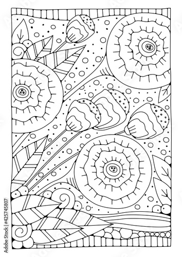 Doodle style flowers, buds, leaves. Art line illustration. Coloring page. Black and white background for coloring.