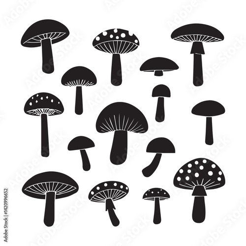 Doodle style mushrooms concept isolated Vector Silhouettes White Background.