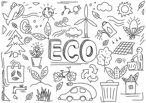 Doodle vector illustration on the theme of ecology and environmental protection.