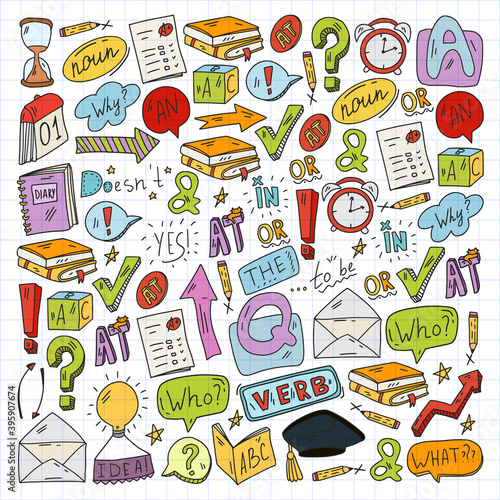 Doodle vector pattern. Illustration of learning English language. E-learning, online education in internet.