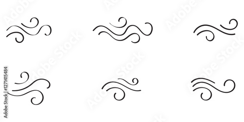 Doodle wind line sketch set. Hand drawn doodle wind air blow, swirl elements.