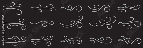 Doodle wind line sketch set. Hand drawn doodle wind motion, air blow, swirl elements. Sketch drawn air blow motion, smoke flow art, abstract line. Isolated on white background . vector illustration.