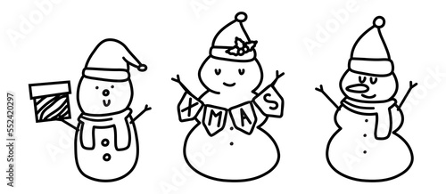 Doodle winter illustration of a snowman with a carrot and a Santa hat. Design greeting cards, posters, gift wrapping.