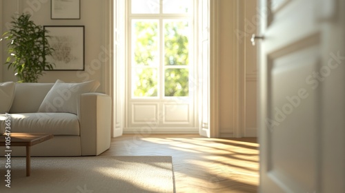 Door opening into bright living area, soft colors, cozy couch, coffee table, natural light, blurred background details, spacious feel.