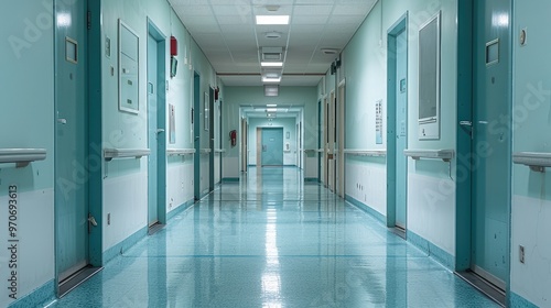 Doors in hospital hall. Generative AI.
