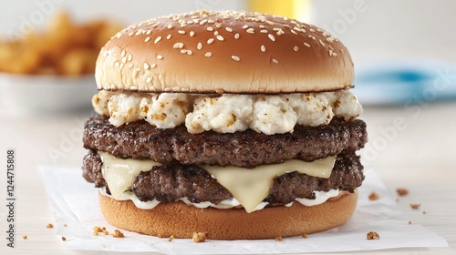 Double cheeseburger with creamy topping, fries in background. Food photography for menu