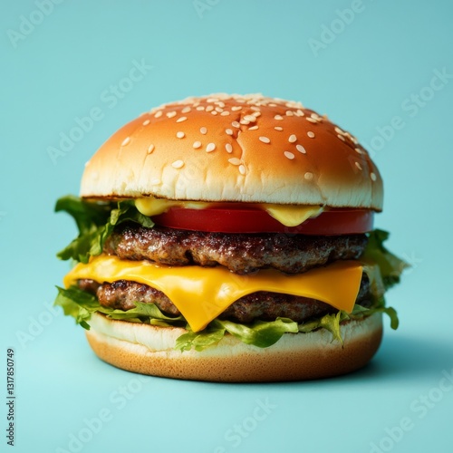 Double cheeseburger with lettuce tomato and sesame seed bun on blue background