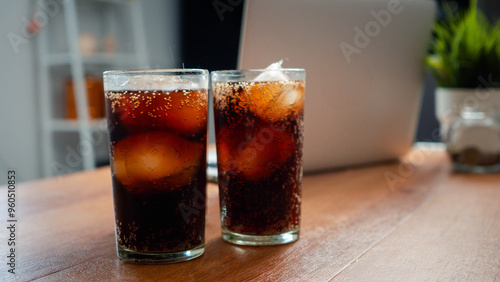 Double cool ice soft drink cola carbonated liquid fresh food with soda water, Cola drinking with ice in glass ready to refresh you, A cola soft drink is placed on the desk.