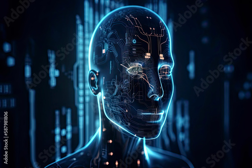 double exposure image of virtual human 3dillustration on blue circuit board background represent artificial intelligence AI technology
