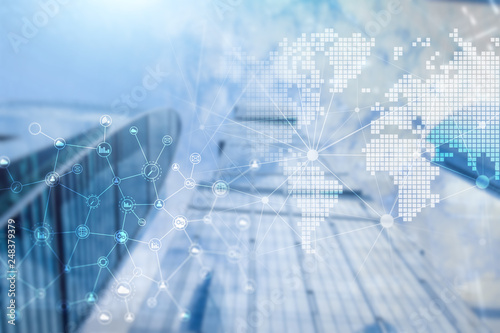 Double exposure mixed media. Diagrams, icons and relations structure on hologram screen. Business people and modern city on background