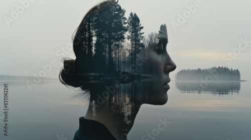 Double exposure of a woman's silhouette and a tranquil forest landscape with a serene lake and misty horizon in the background.